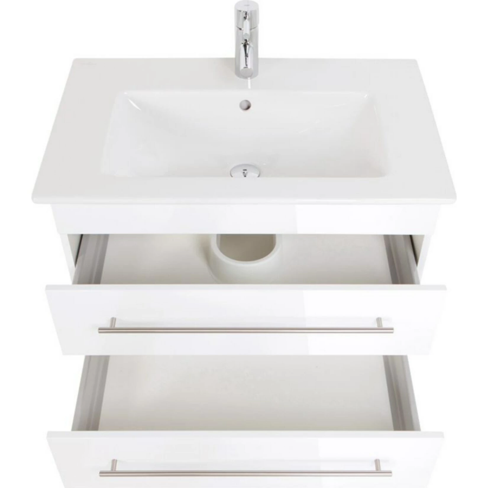Dieser Waschtisch mit Villeroy & Boch Waschbecken, in Weiß Hochglanz und mit 2 Softclose-Schubladen versehen bringt Ihr Badezimmer regelrecht zum Strahlen: Die modern-elegante, feinkantige Formsprache mit dem rechteckigen Keramik-Waschbecken und dem schicken, geometrisch definierten Unterschrank mit 2 Softclose-Schubladen ist die souveräne und stilsichere Antwort auf den aktuell gefragten Trend zum Minimalismus. Durch die glasklare, rechteckige Linienführung mit komfortabler Abstellfläche, einer Zargenhöhe von 18 mm und einer Beckentiefe von 165 mm macht das Keramik-Waschbecken einen beeindruckend schicken und dennoch angenehm dezenten Eindruck.