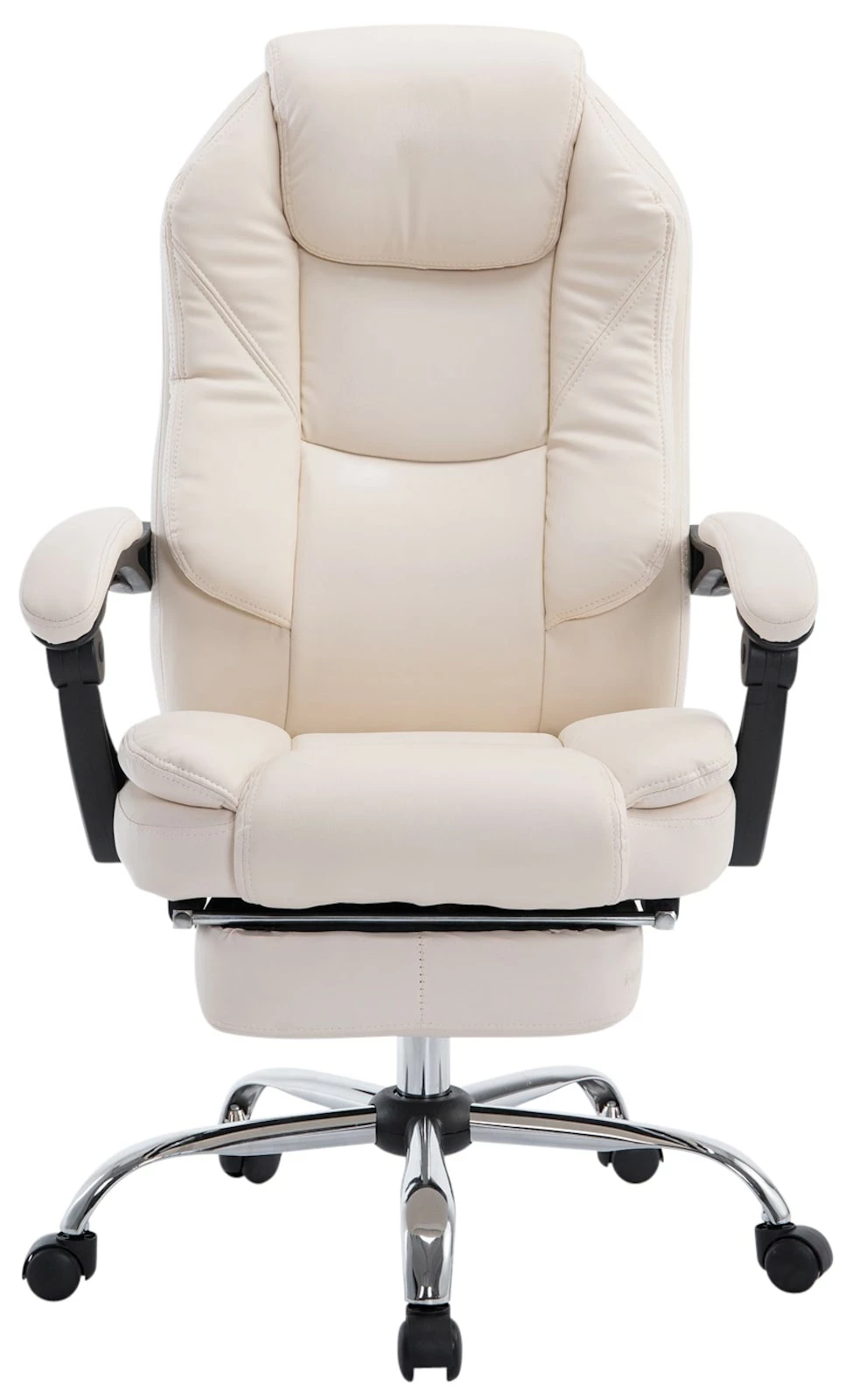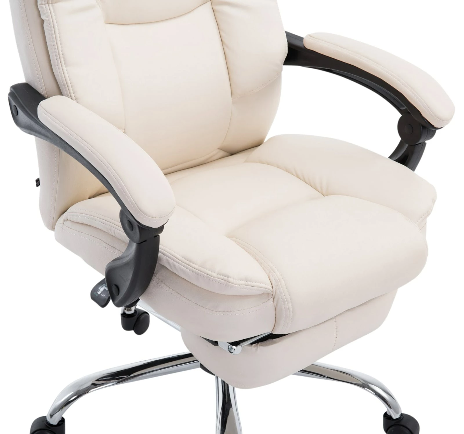 Mit dem Bürostuhl Castle ist Gemütlichkeit im klassischen Look angesagt. Eine hochwertige Polsterung und ein pflegeleichter Kunstlederbezug sorgen für ein komfortables Sitzgefühl, welches auch bei längerem Verweilen bestehen bleibt. Die leicht verstellbare Fußstütze und Rückenlehne sorgen zusätzlich für eine angenehme Pause zwischendurch, bei der sich entspannt zurückgelehnt werden darf und die Beine hochgelegt werden können. Dank der stufenlos verstellbaren Sitzhöhe garantiert der Bürostuhl Castle zudem jederzeit ein ergonomisches Sitzen. Dabei steht er standsicher auf fünf Leichtlaufrollen und einem Gestell aus Metall in Chromoptik.