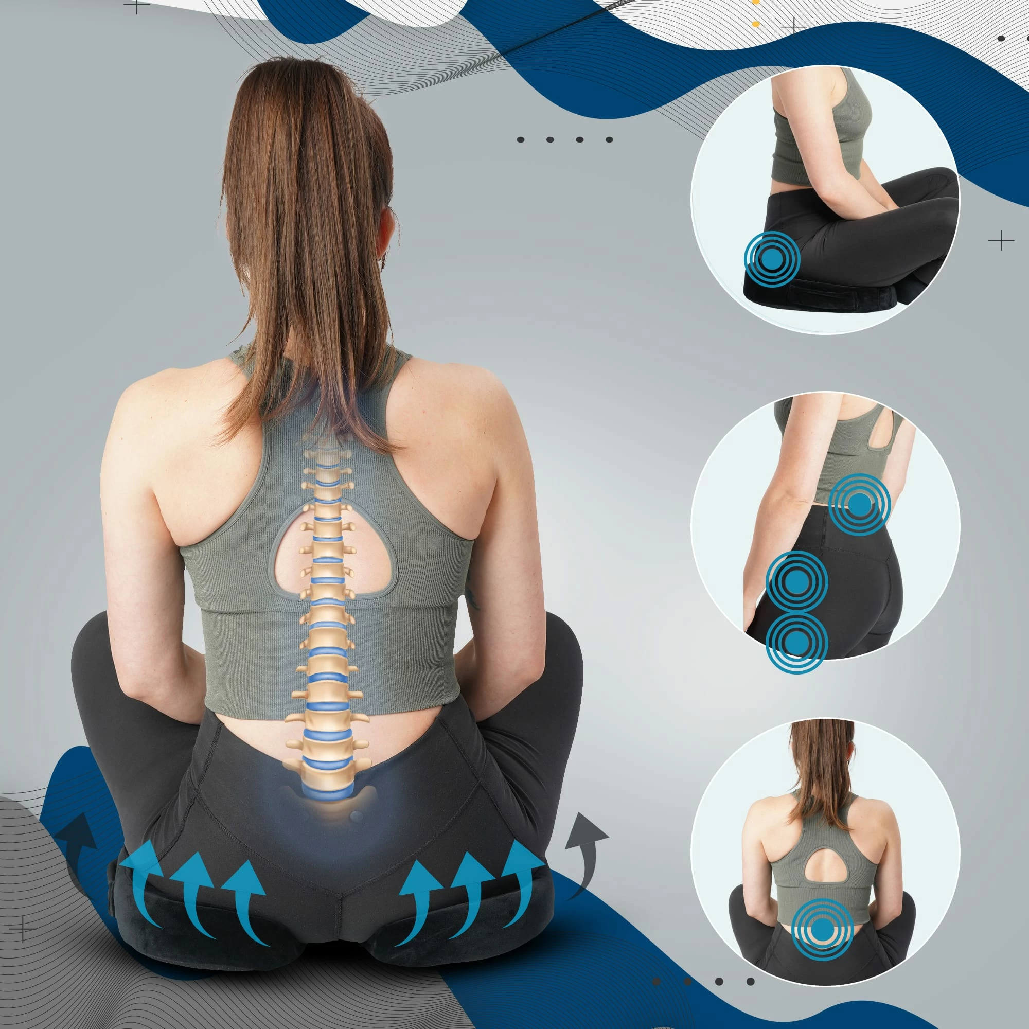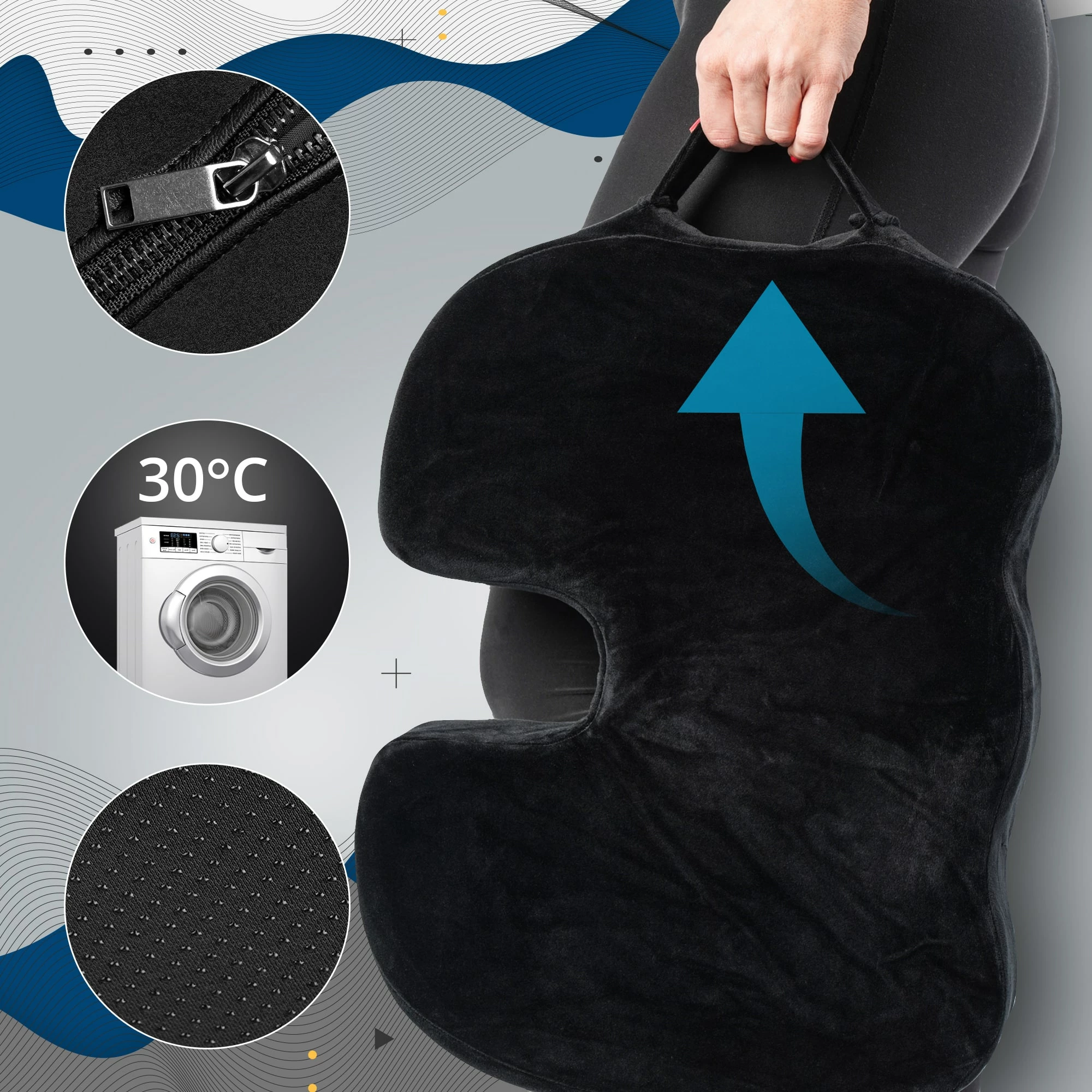 Das orthopädische Sitzkissen wurde speziell zur Linderung von Symptomen entwickelt, die durch Steißbeinverletzungen, Ischias, Dekubitus und häufiges Sitzen verursacht werden. Es hilft auch, die Haltung und die Durchblutung zu verbessern. Das Kissen hebt und stützt sanft die Wirbelsäule, lässt Platz für das Steißbein im Sitzen und fördert eine gesunde Haltung, indem es die Wirbelsäule auf natürliche Weise ausrichtet und den Druck auf den unteren Rücken entlastet.