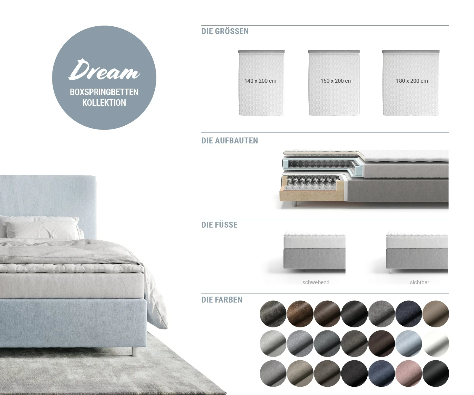 Mit diesem raffinierten Modell unserer Kollektion Dream vereinen sich höchster Liegekomfort und klassisches Design zu einem Boxspringgestell von erstklassiger Qualität. Machen Sie das Boxspringgestell zu Ihrer eigenen eleganten Wohlfühloase, indem Sie es mit einer passenden Matratze und optional einem Topper ganz nach Ihren wünschen vervollständigen.