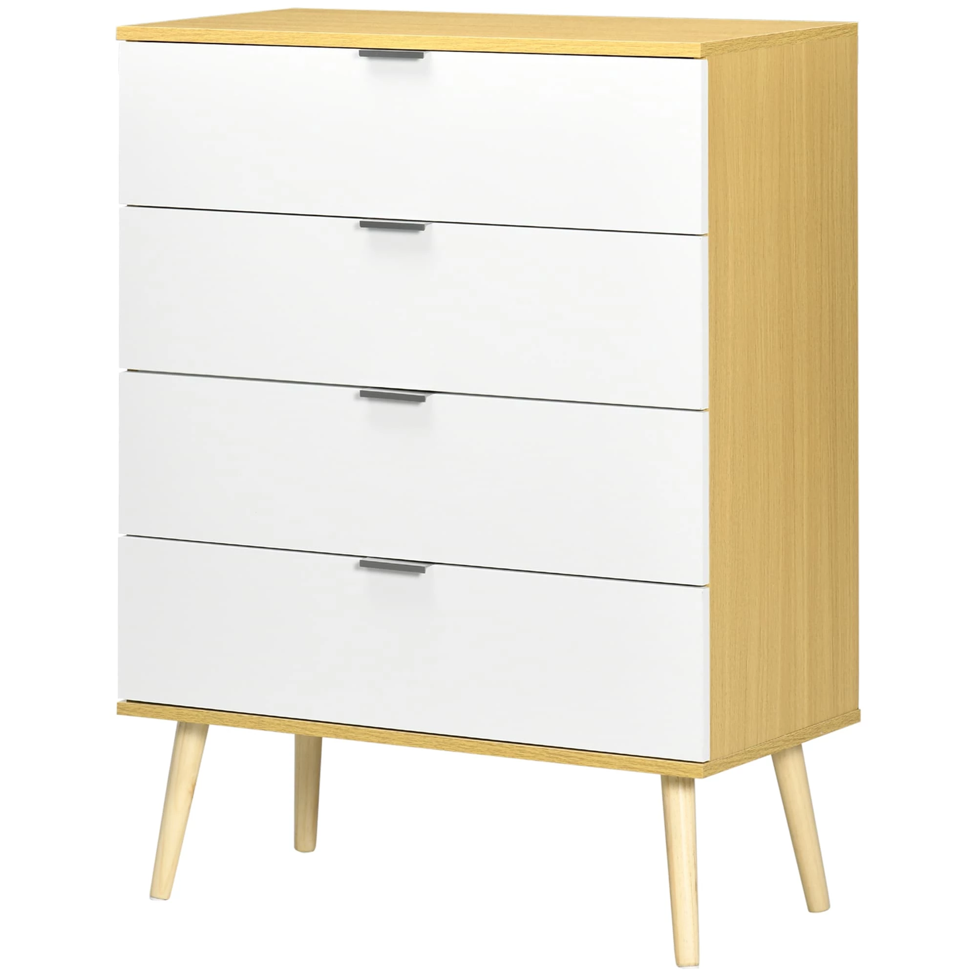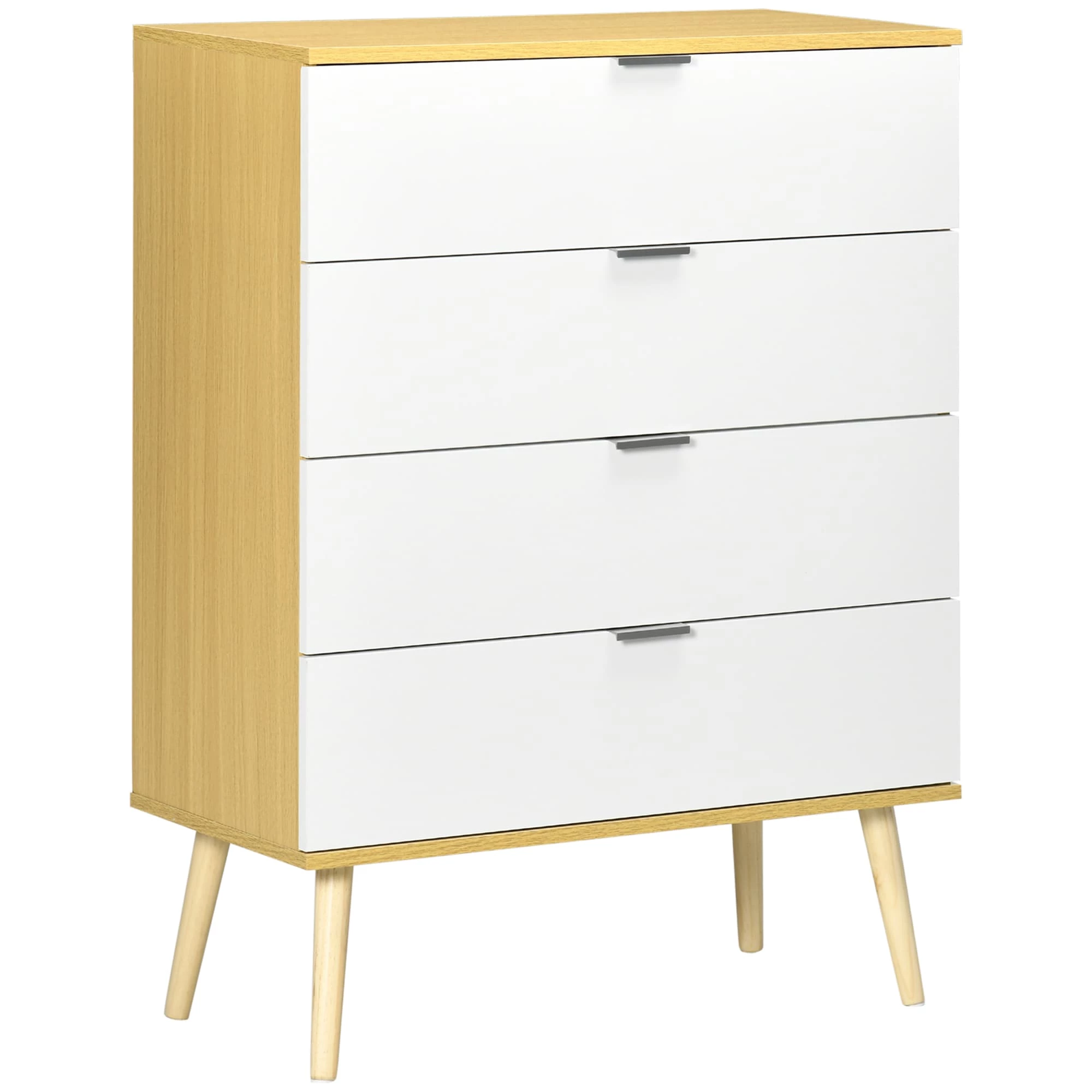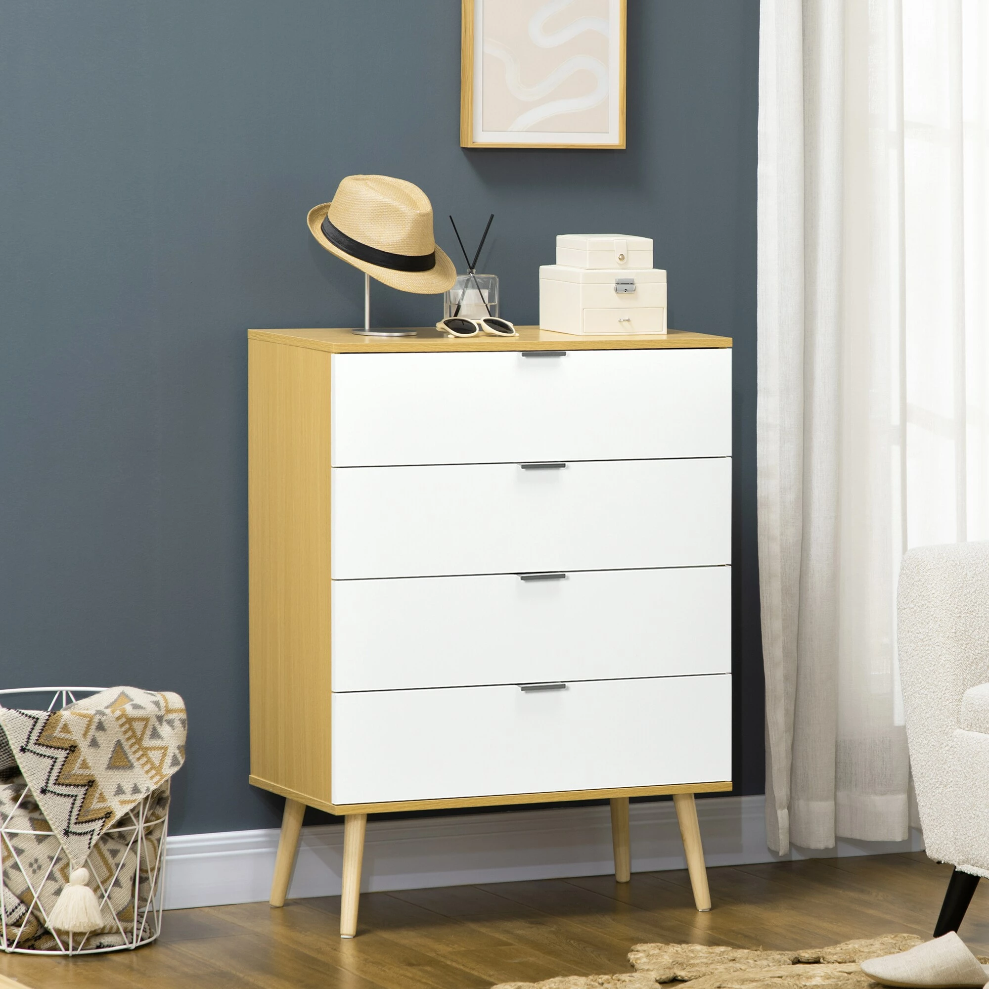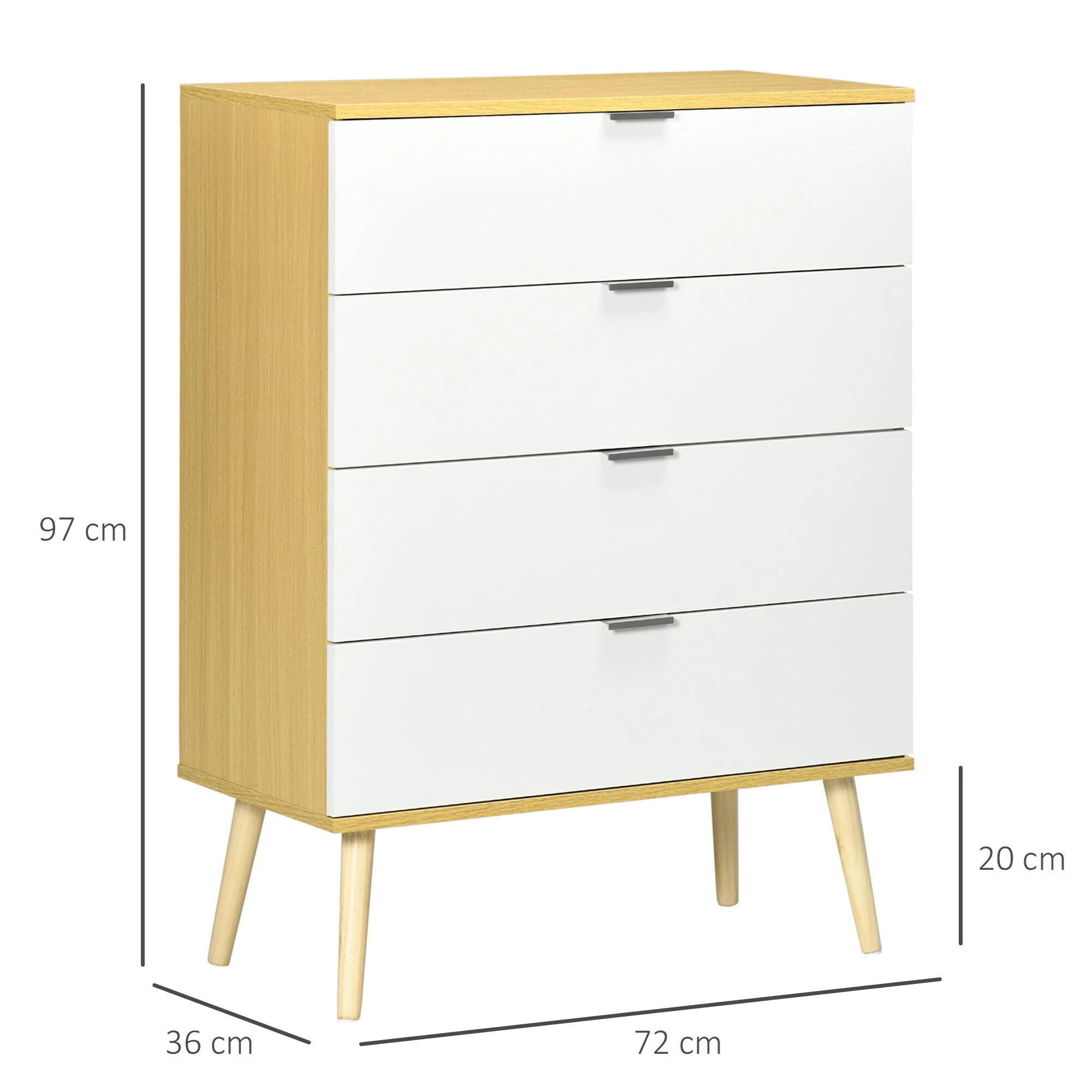 Sind Sie auf der Suche nach Stauraumlösungen und einem dekorativen Update für Ihr Schlafzimmer? Eine Möglichkeit, für mehr Stil und Ordnung zu sorgen, ist der Besitz einer neuen Kommode. Diese Kommode verfügt über vier Schubladen, die viel Stauraum bieten – ein Muss, um die Kleidung im Schlafzimmer zusammenzuhalten. Alle Schubladen sind mit Aluminiumgriffen ausgestattet, für ein leichtes Öffnen und Schließen. Die Kommode besteht aus solidem Holzwerkstoff und Kiefernholz.
