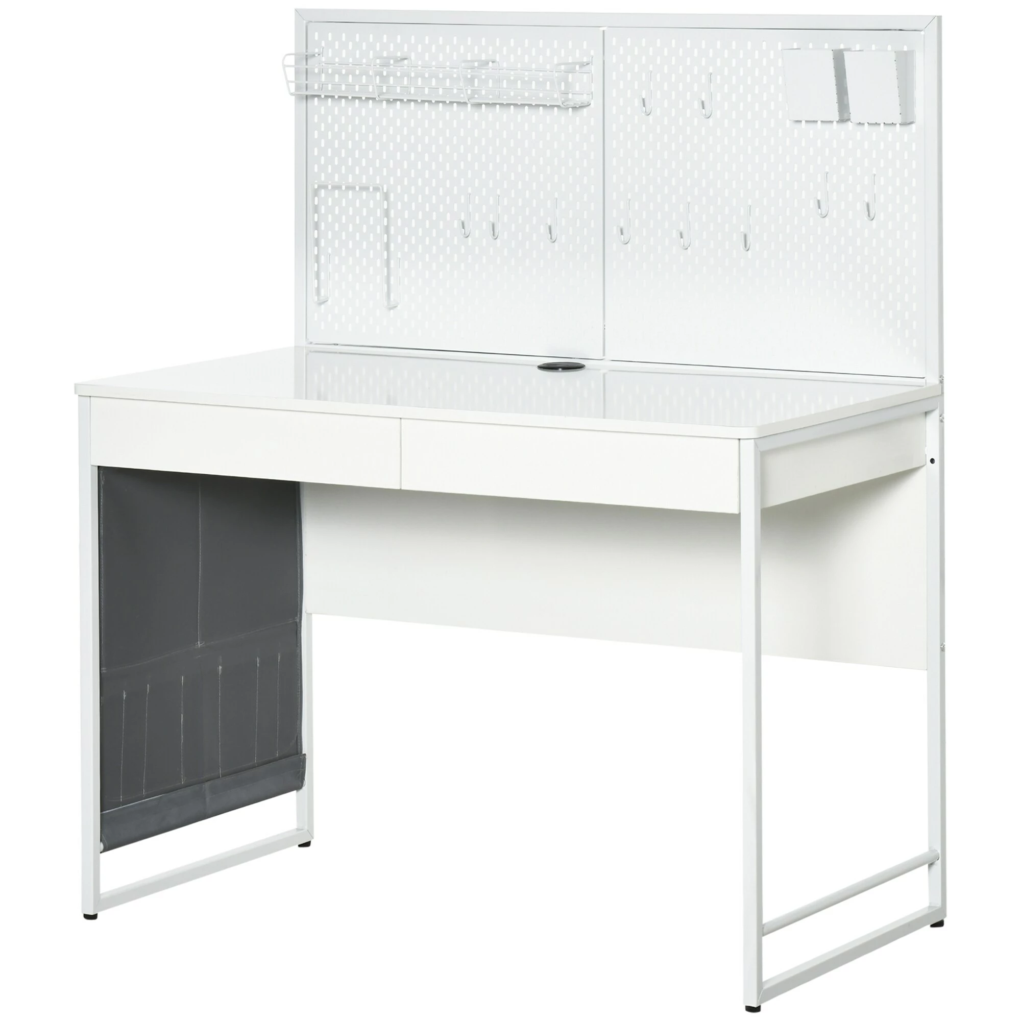 - Eine große Arbeitsfläche, zwei Schubladen und eine Seitentasche