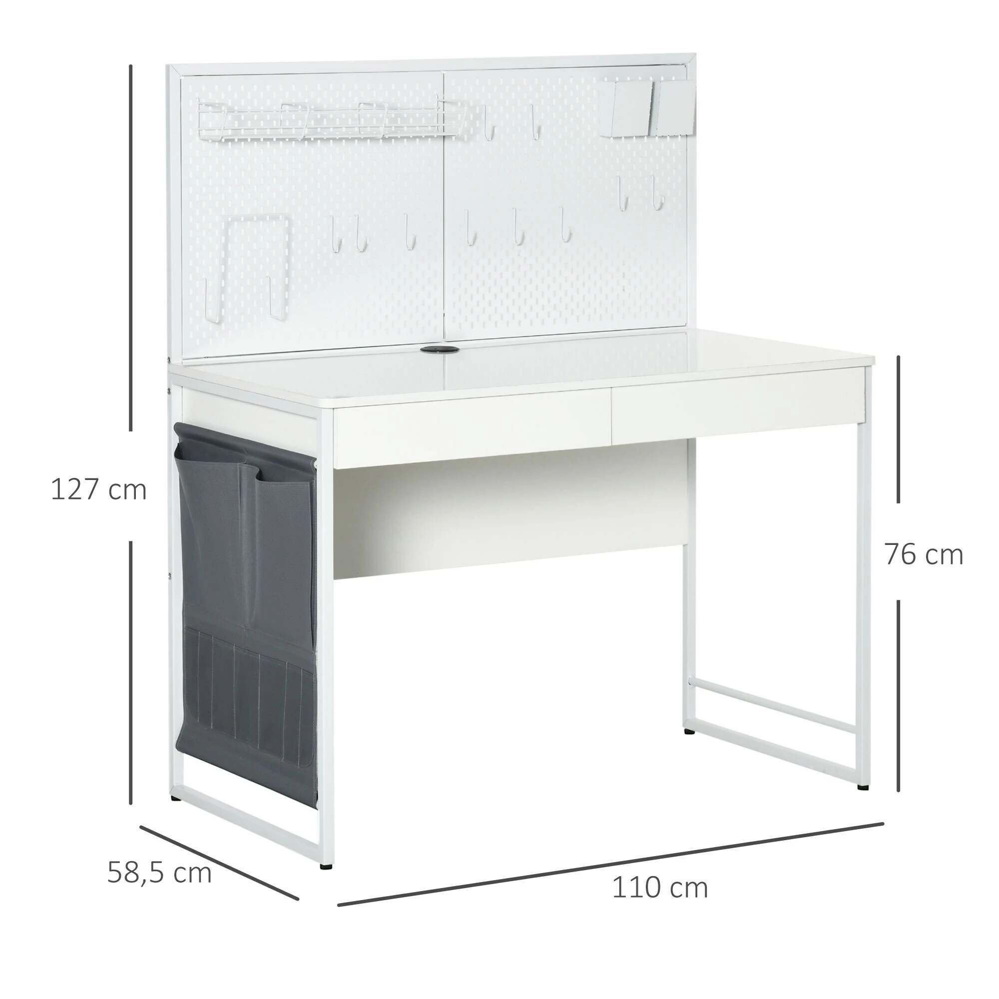 Sie arbeiten von zu Hause aus und benötigen einen Schreibtisch, der ihnen das Arbeiten von Zuhause erleichtert? Dieser Schreibtisch ist das perfekte mobile Büro für Sie. Eine Pinnwand, Aufbewahrungskörbe, Stifthalter und eine große Seitentasche mit vielen Fächern bieten viel Platz für Zubehör, Dekoration und Büromaterial. Unter dem Tisch befindet sich eine große Stellfläche für Bürogeräte. Der stabile Rahmen aus Metall macht den Schreibtisch solide, robust und pflegeleicht.