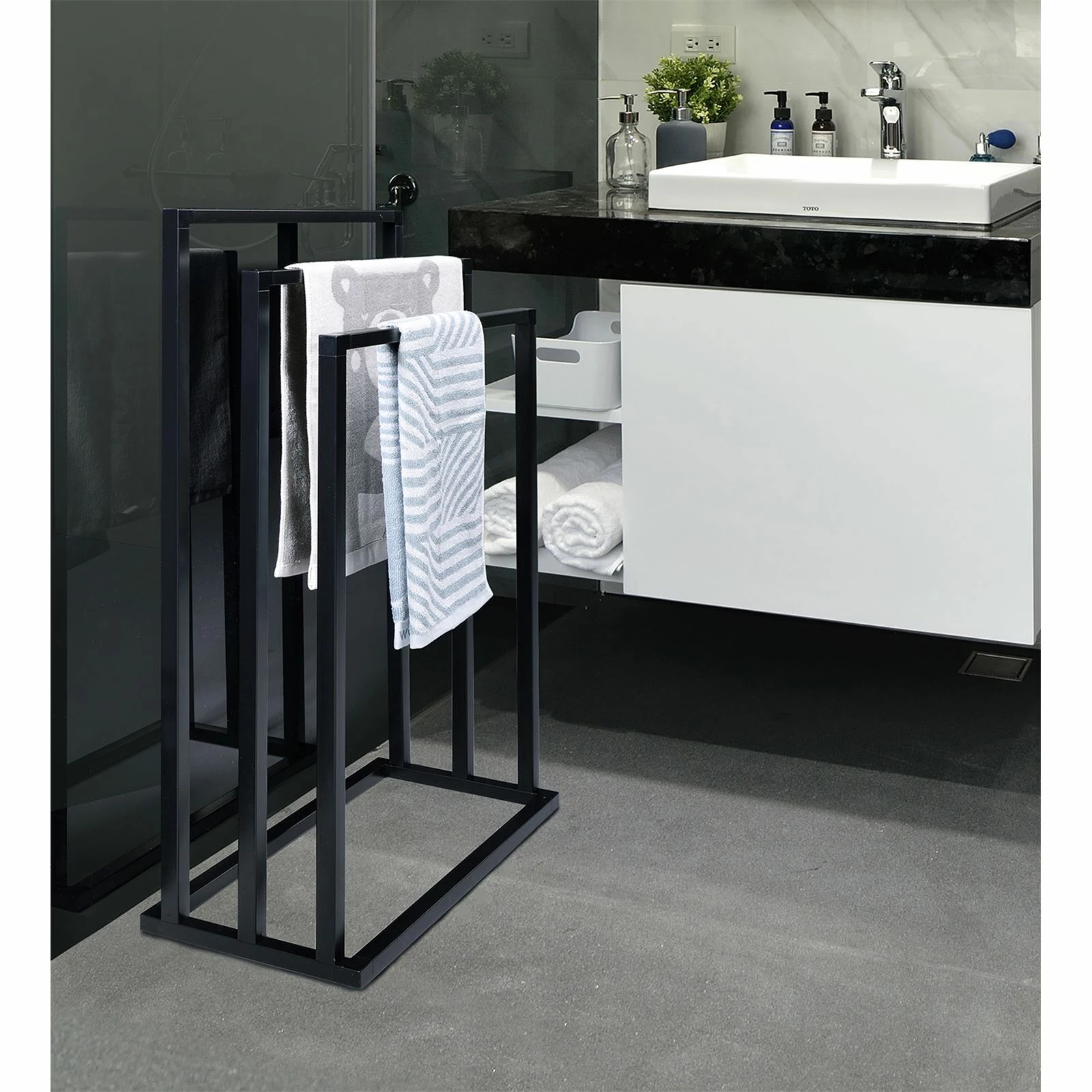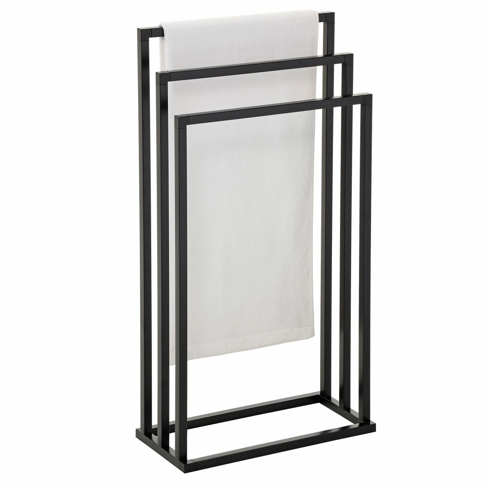 bringt Ordnung für Ihre Handtücher in das Badezimmer. Er eignet sich für das Trocknen und Aufhängen von Ihren Badetücher, Duchschtücher und Waschlappen. Mit seinem modernen Design lässt sich unser Handtuchständer mit Ihren schon vorhandenen Möbel leicht kombinieren. Dieser Badetuchhalter hat 3 Handtuchstangen, damit zum Beispiel, das Duschtuch nach dem Duschen zum Trocknen aufgehängt werden kann.
