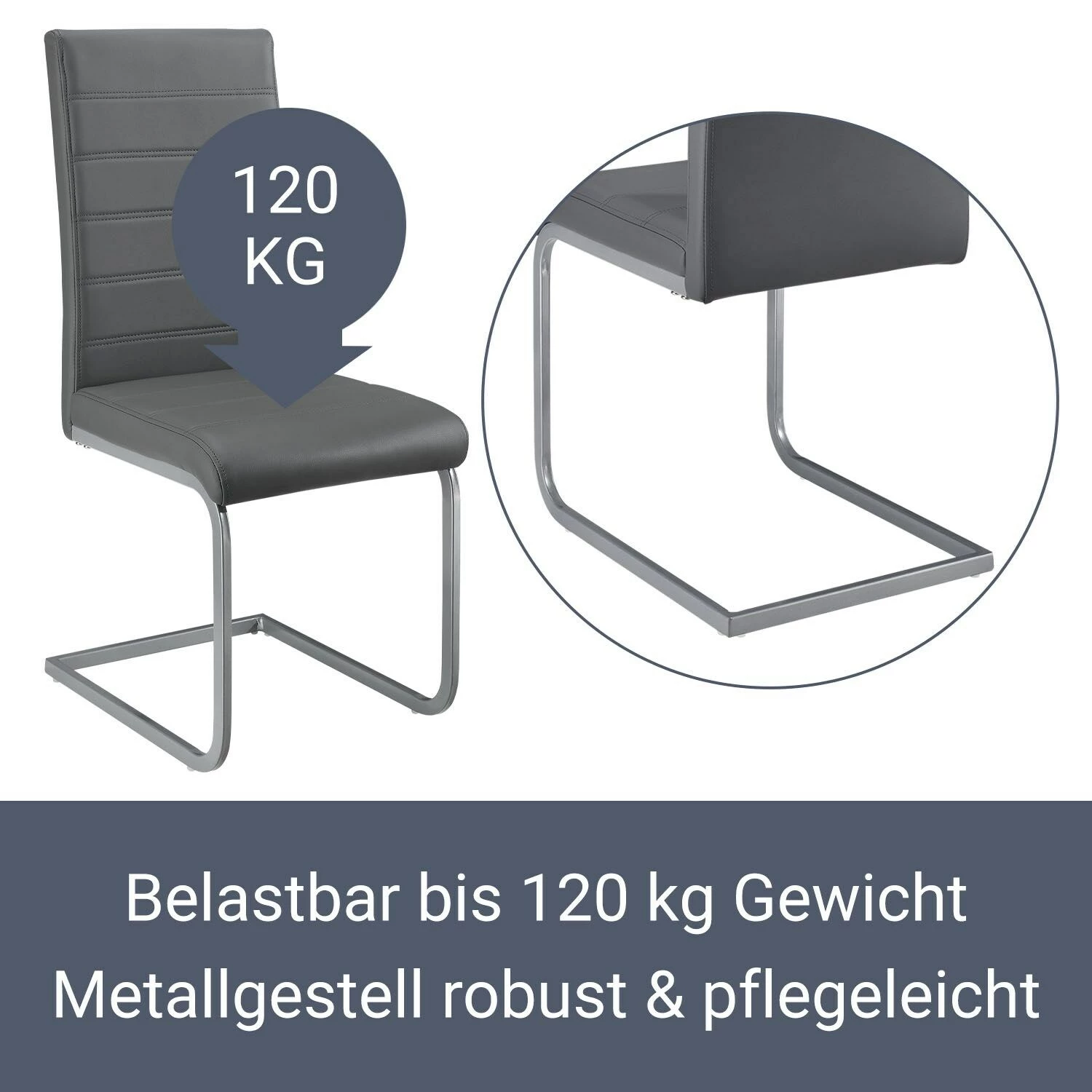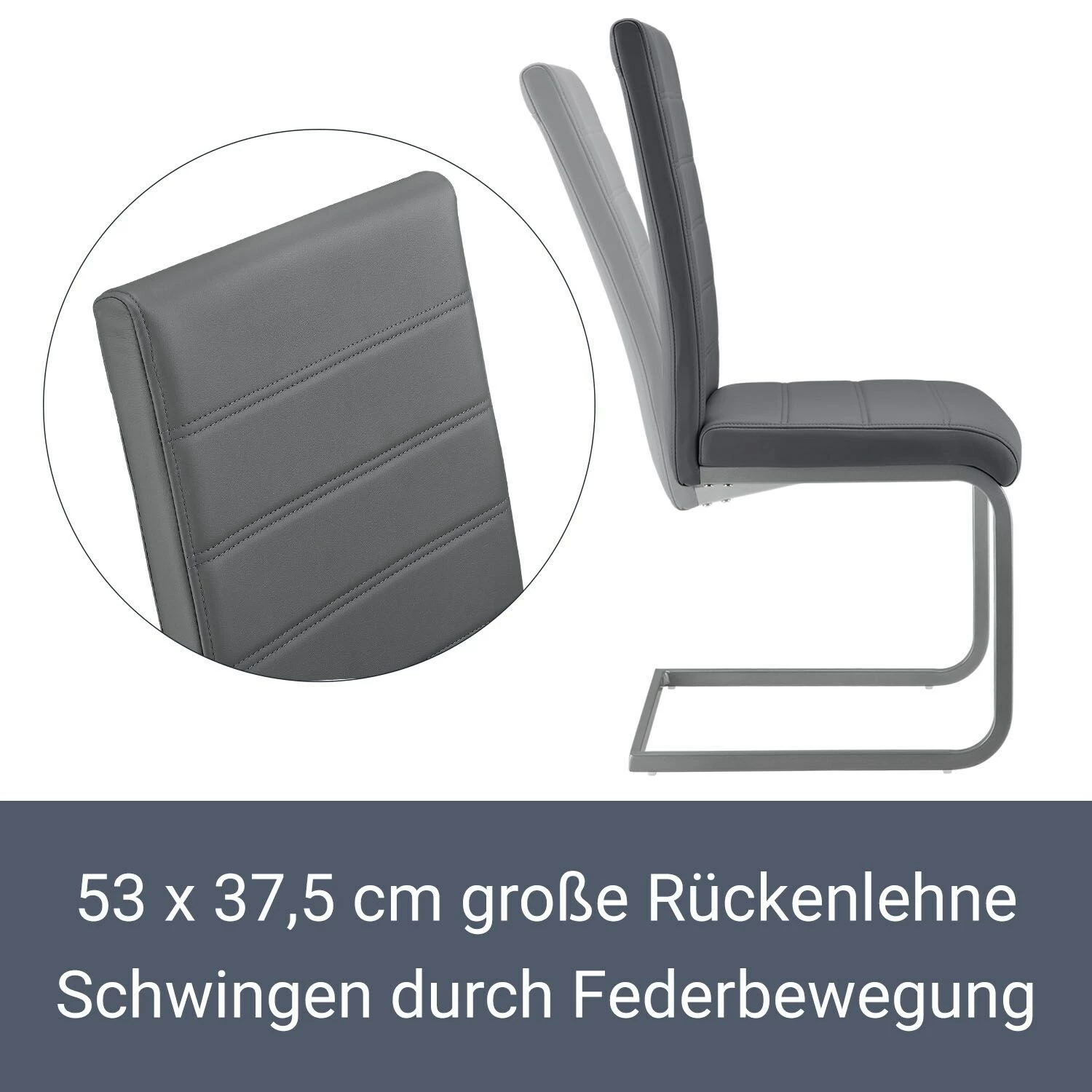 Sie möchten beim Sitzen leicht schwingen? Mit Körperdruck bringen Sie das 2er-Set Freischwinger Stuhl Vegas (Grau) in kleine Schwingungen und beugen so einer steifen Sitzhaltung vor. Verbringen Sie hier gemütliche Stunden mit Ihrer Familie oder Freunden! Gefertigt ist der stabile Esszimmerstuhl aus Metall und weichen Polstern mit Kunstleder-Bezug. Optisch überzeugt der elegante Schwingstuhl in Esszimmer, Küche, Wohnzimmer oder Arbeitszimmer. Mit der schlichten Lederoptik verleihen die modern gestalteten Esstisch Stühle einen stilvollen Charme und zeigen sich überaus pflegeleicht. Das Set ist zudem günstig und schnell aufgebaut.