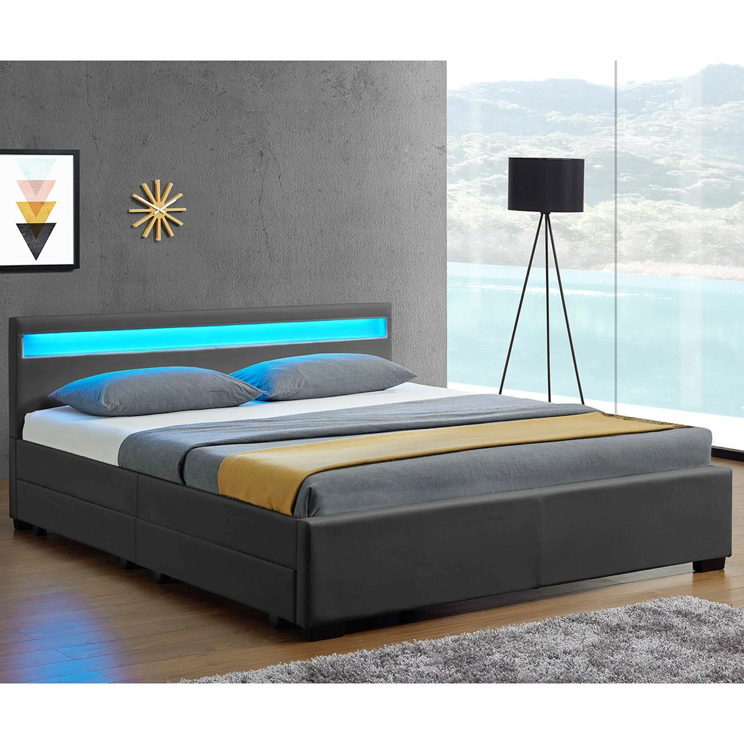 Das Polsterbett Lyon hat eine schlichte und moderne Leder-Optik, welche bei Groß und Klein punktet. Das weich gepolsterte Kopfteil ist zusammen mit der integrierten LED-Leiste der Blickfang des facettenreichen Möbelstücks. Der widerstandsfähige Kunstlederüberzug wird spielend einfach mit einem feuchten Tuch gereinigt.