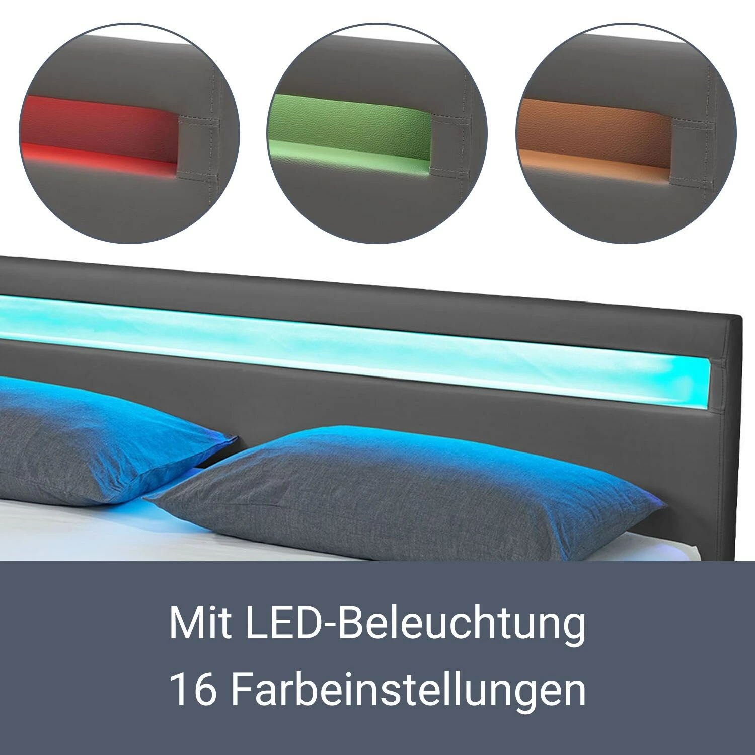 Eine im Kopfteil eingelassene LED-Leiste sorgt für eine stimmungsvolle Atmosphäre im Schlafzimmer. Es stehen Ihnen 16 verschiedene Farbeinstellungen zur Verfügung, die Sie bequem per Fernbedienung kontrollieren. Dank der indirekten Beleuchtung können Sie selbst auf eine Nachttischlampe verzichten.