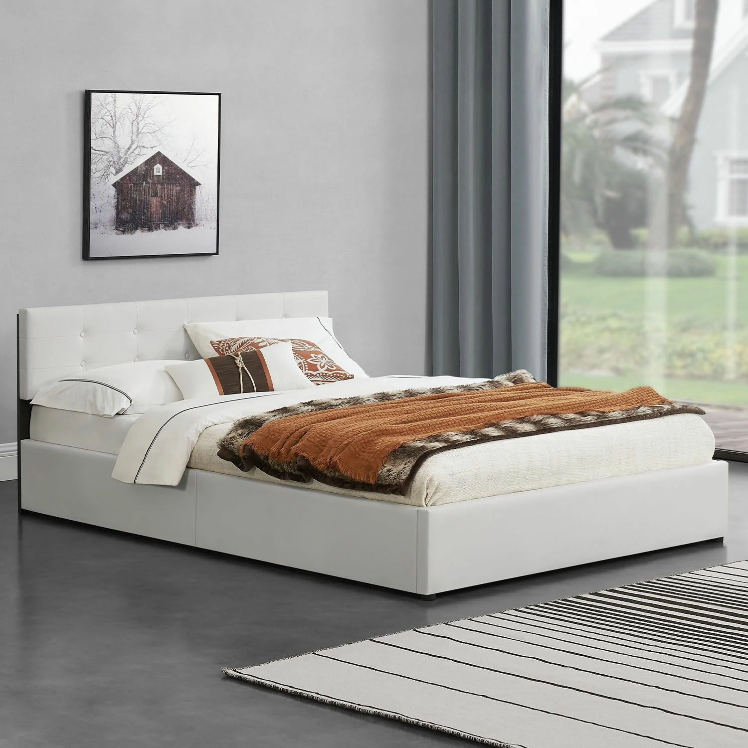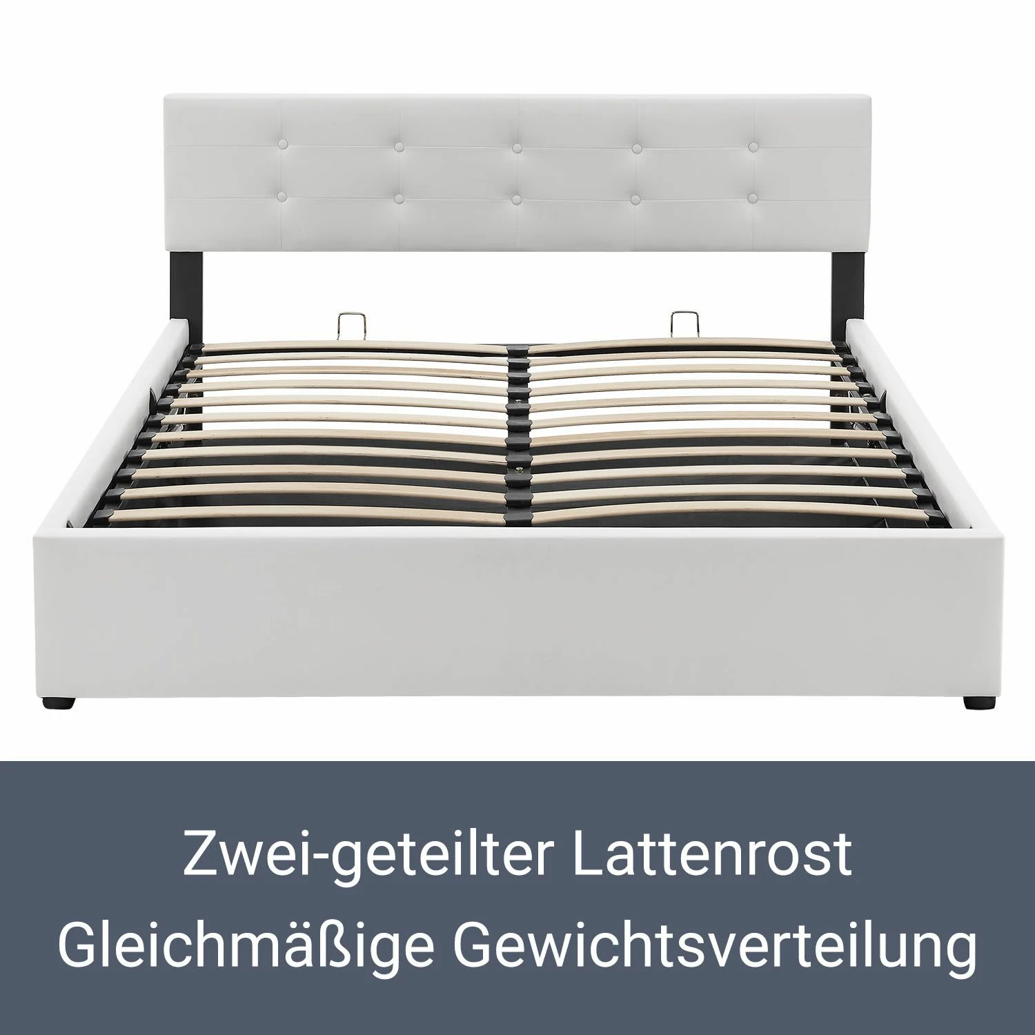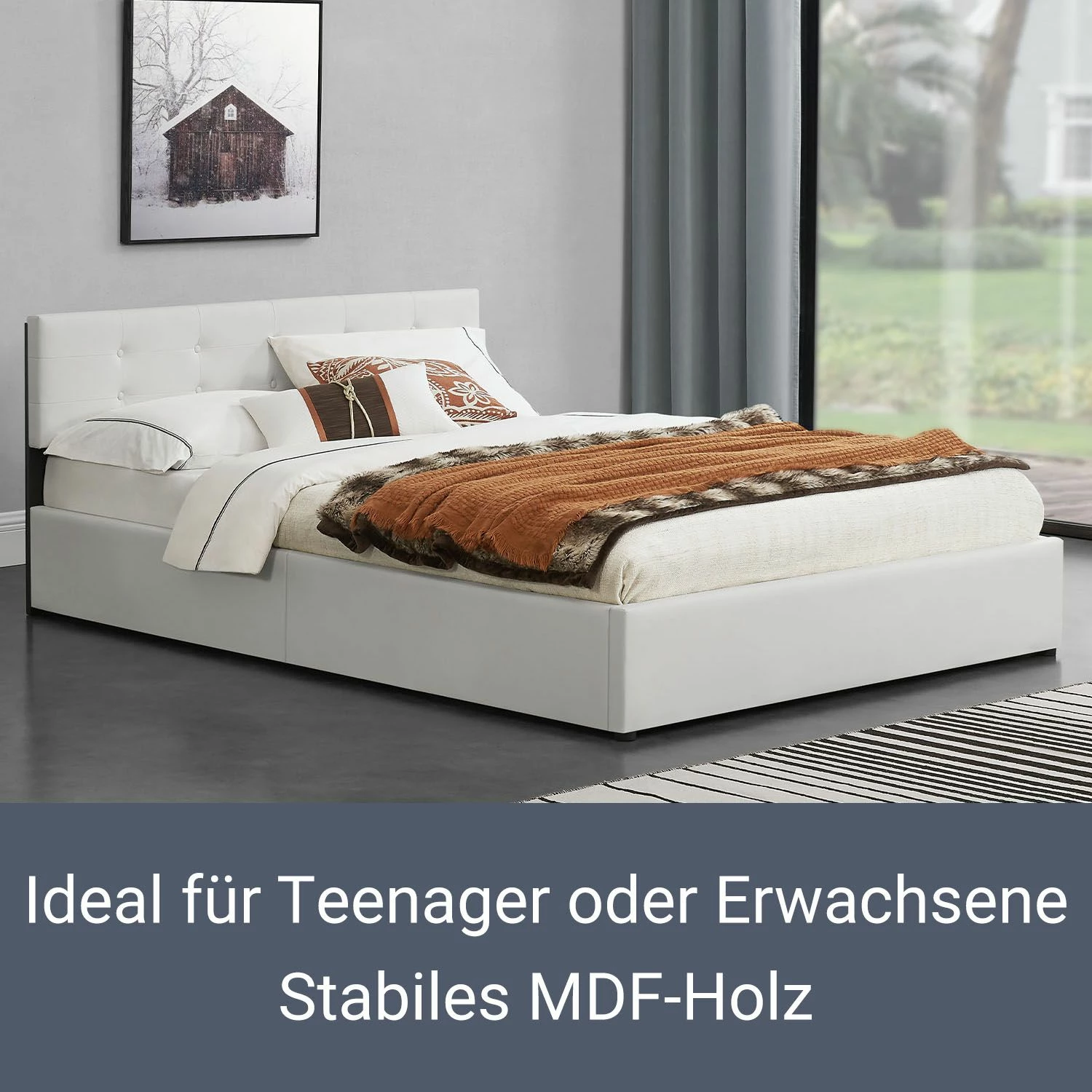 Unser Polsterbett Marbella (140×200 cm, weiß) samt hochklappbarem Lattenrost und darunter liegendem Bettkasten ist der optimale Rückzugsort zum Ausruhen und Träumen. Der belastbare Lattenrost sorgt bei Erwachsenen wie auch Jugendlichen und Kindern für eine ruhige Nacht und einen wohltuenden Schlaf. Ein geräumiger Bettkasten sichert extra Stauraum für Kleidung, Spielzeug oder Ähnliches. Das klassische Design mit gestepptem Kopfteil fügt sich wunderbar in nahezu jedes Schlafzimmer ein. Der weiße Kunstlederbezug ist zudem pflegeleicht und robust.