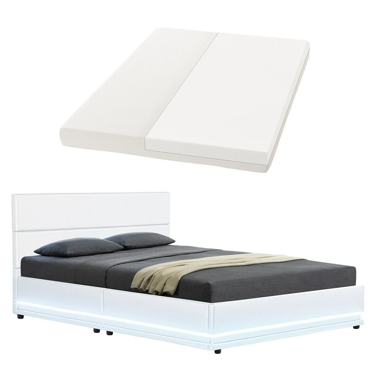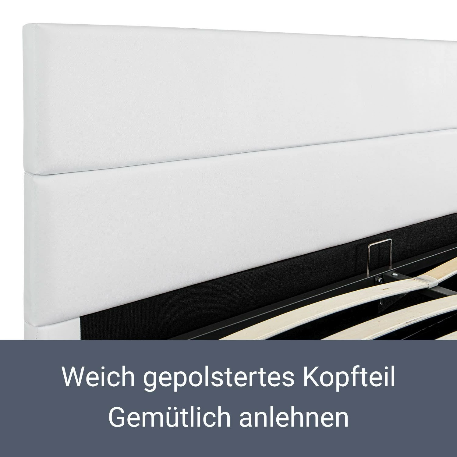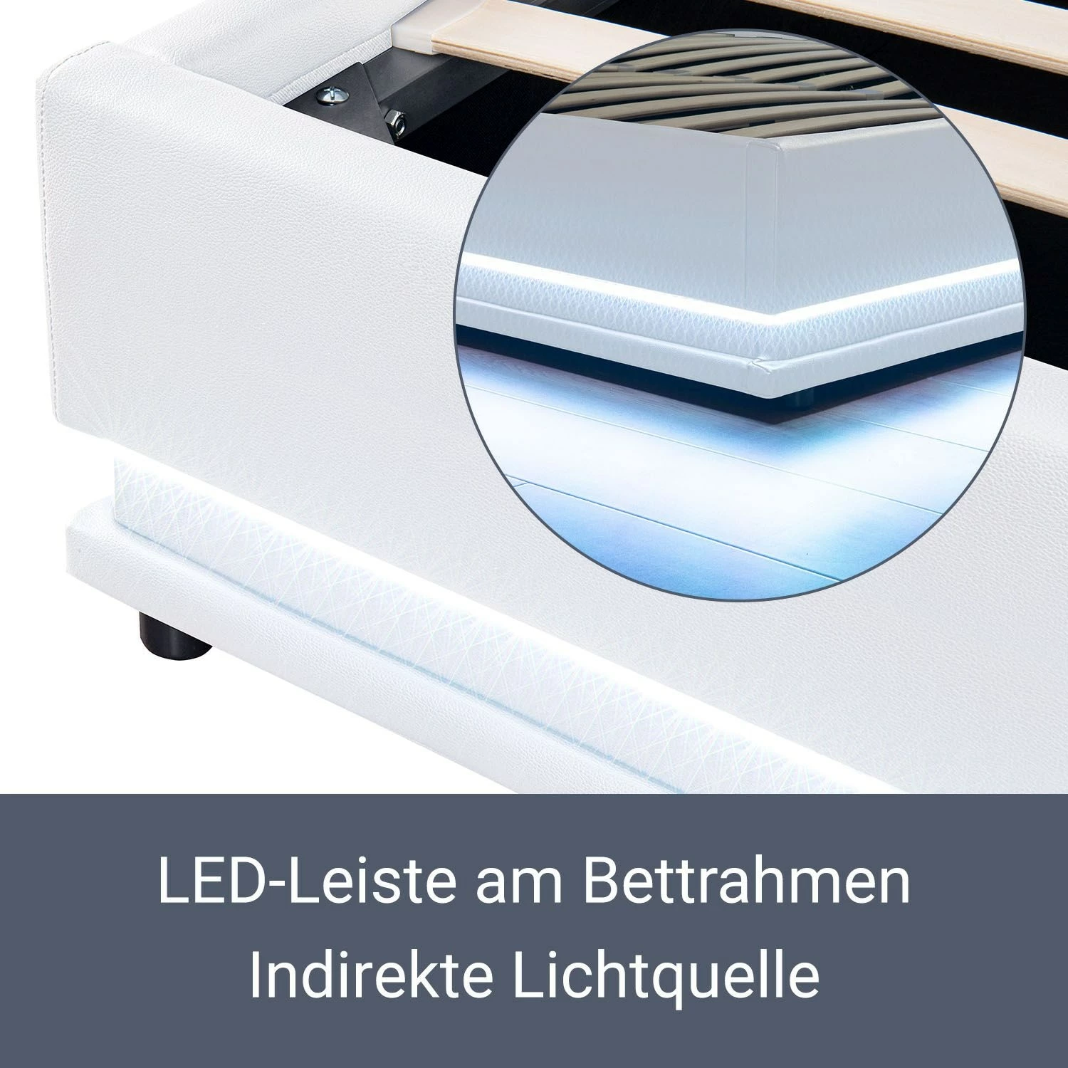 Das LED Polsterbett Toulouse (140×200 cm, weiß) ist ein geräumiges Einzel- oder Jugendbett mit Lattenrost, Matratze und viel Stauraum. Auf dem stabilen Lattenrost und der ergonomischen Kaltschaummatratze liegen Sie ideal, um gesund und erholsam zu schlafen. Zudem befindet sich in dem darunter liegenden Bettkasten viel Platz für Bettwäsche. Das Kunstlederbett mit modern-schlichtem Design wird zweifellos der neue Blickfang in Ihrem Gäste- oder Schlafzimmer. Im Bettrahmen befindet sich zudem eine LED-Leiste in Bodennähe, die sich über beide Seiten und das Fußende streckt.