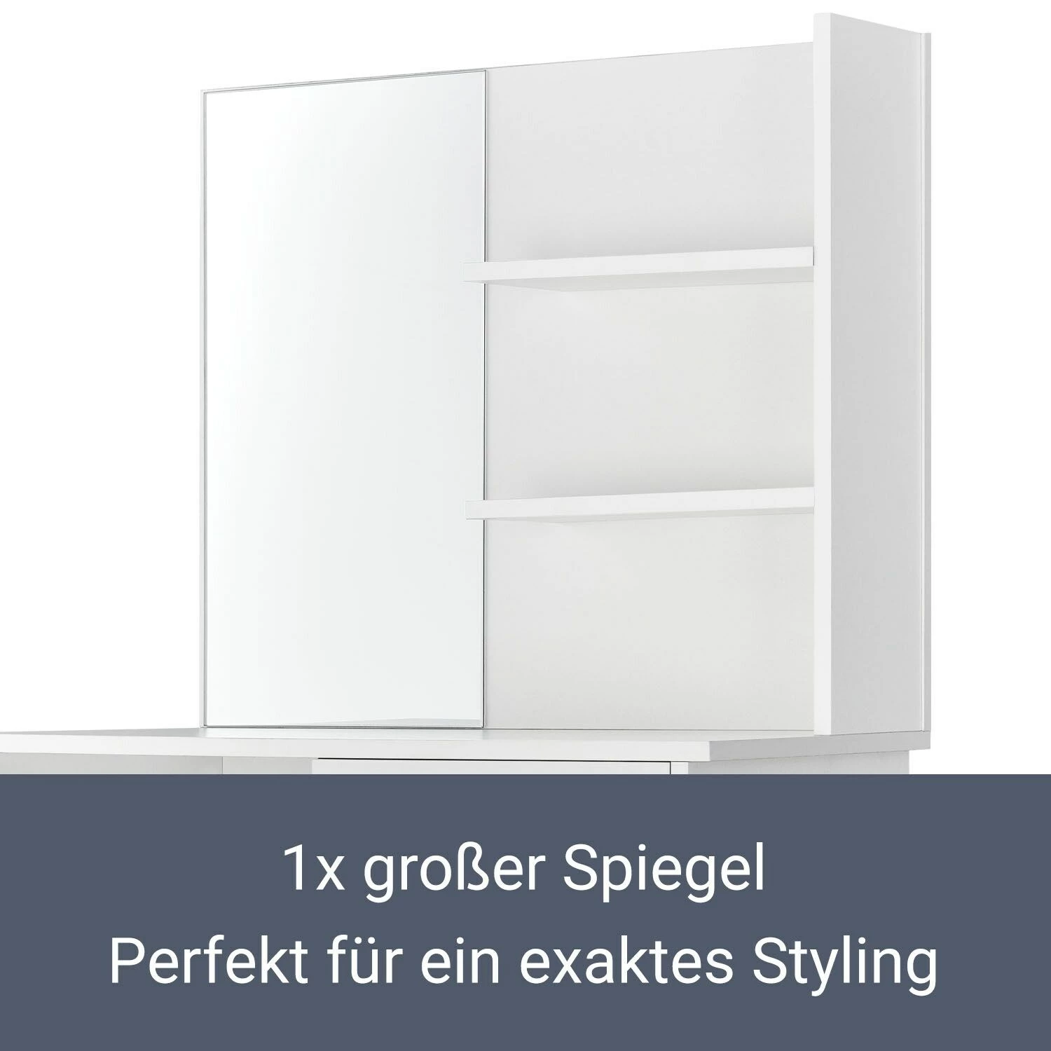 Stauraum gefällig? Unter dem Tisch befindet sich eine 34 x 27 cm große Schublade für Pinsel, Bürsten und Schmuck. Zusätzlich stehen Ihnen die beiden 34 × 17 cm großen Ablagen neben dem Spiegel zur Verfügung – ideal für Parfüms, Nagellacke und Cremes. So haben Sie wichtige Kosmetik stets griffbereit.