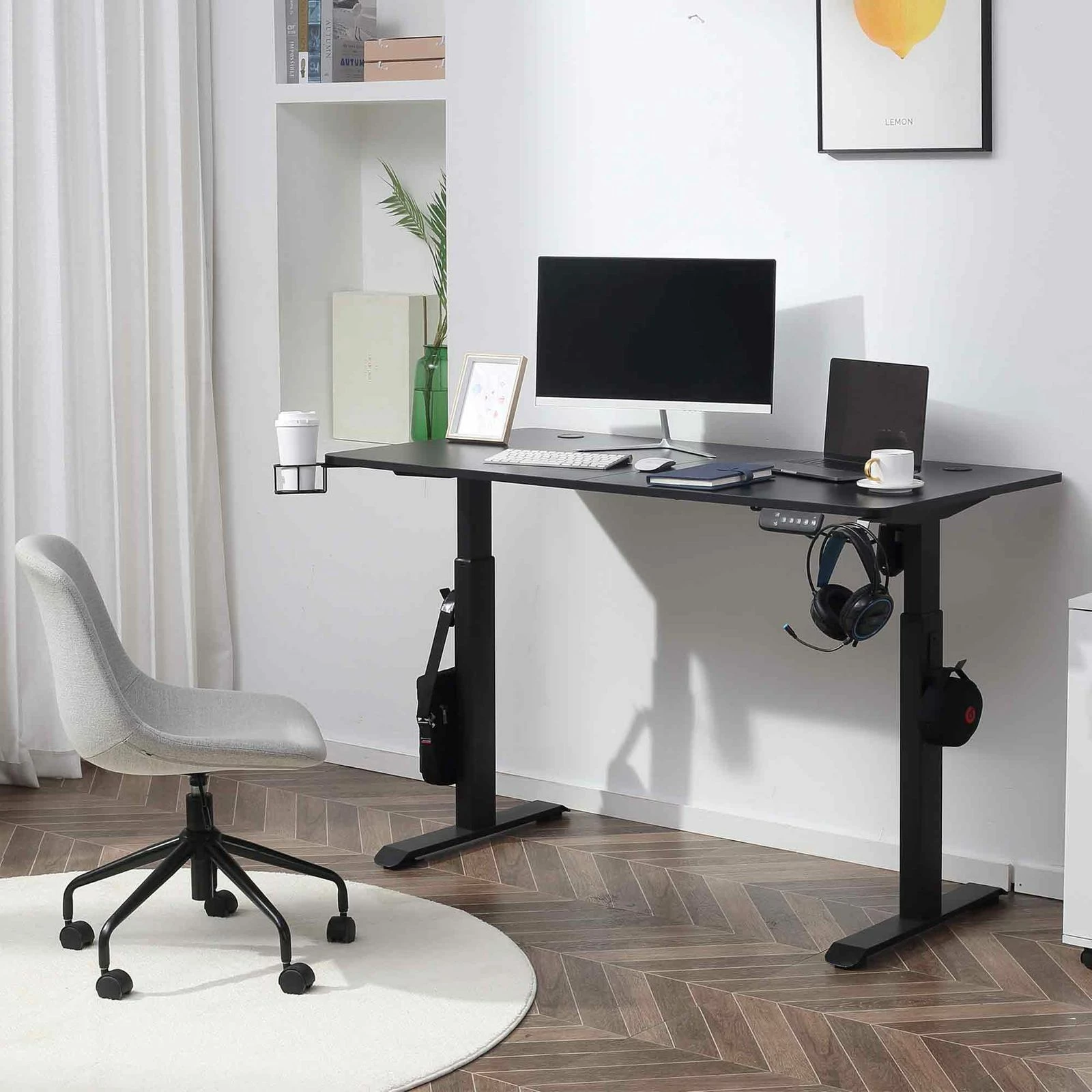 Der funktionale, auf eine lange Lebensdauer ausgelegte Computertisch zeichnet sich durch robuste Stahlfüße in den Farbtönen Weiß und Schwarz aus. Extra dicker Stahl sorgt für eine hohe Standfestigkeit und Stabilität. Selbst in maximaler Arbeitshöhe wackelt der Schreibtisch nicht und Sie können in Ruhe arbeiten. Extras – wie ein verstellbarer Kopfhörerhalter und ein verstellbarer Getränkehalter – machen den Tisch zu einer komfortablen Arbeitsumgebung, die Sie Ihren individuellen Bedürfnissen anpassen können. Die Höhenverstellung des Tischgestells erfolgt elektrisch über ein intuitiv bedienbares, übersichtliches Control Panel. Die Höhe des Tisches ist in einer Spanne von 75 – 115 cm einstellbar.