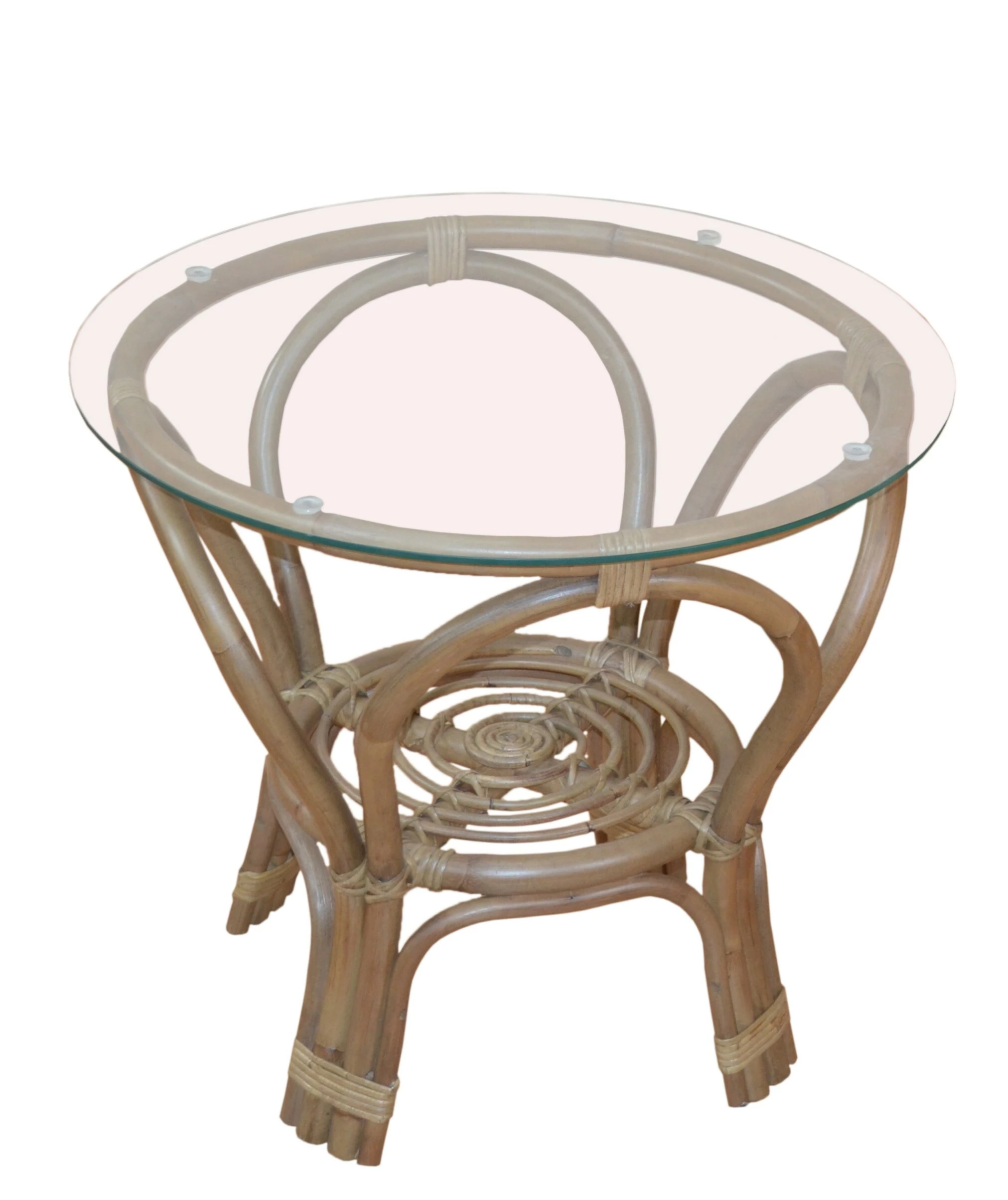 Rattantisch mit einem stabilem Gestell aus Kuburattan mit Rattanablage handgeflochten. Die Oberfläche ist naturgrau, lackiert. Oben aufgelegt eine runde Klarglas-Sicherheitsglasplatte ca. 60 cm Durchmesser. Der Artikel wird montiert geliefert, einfach nur Glasplatte oben auf das Gestell auflegen.