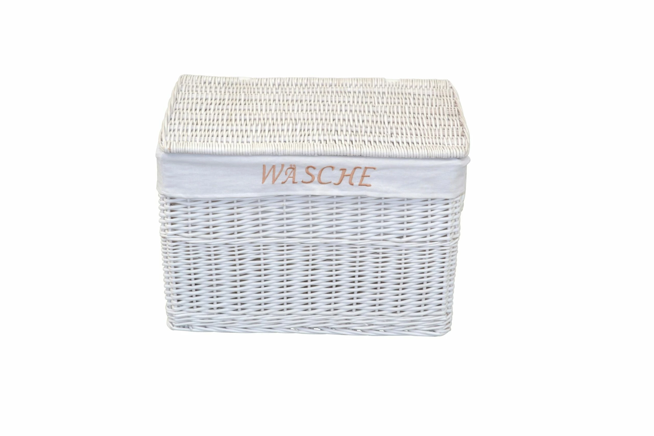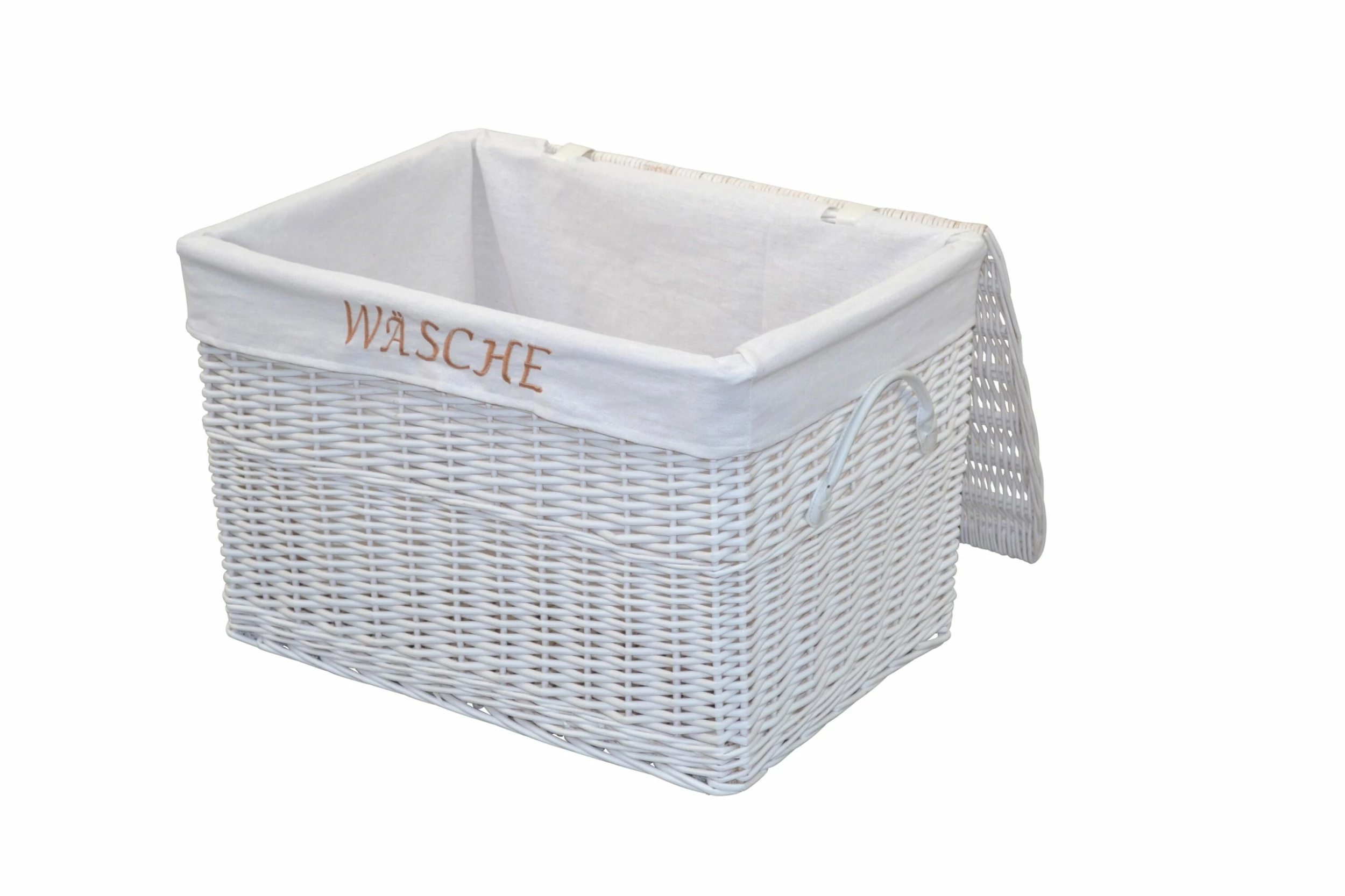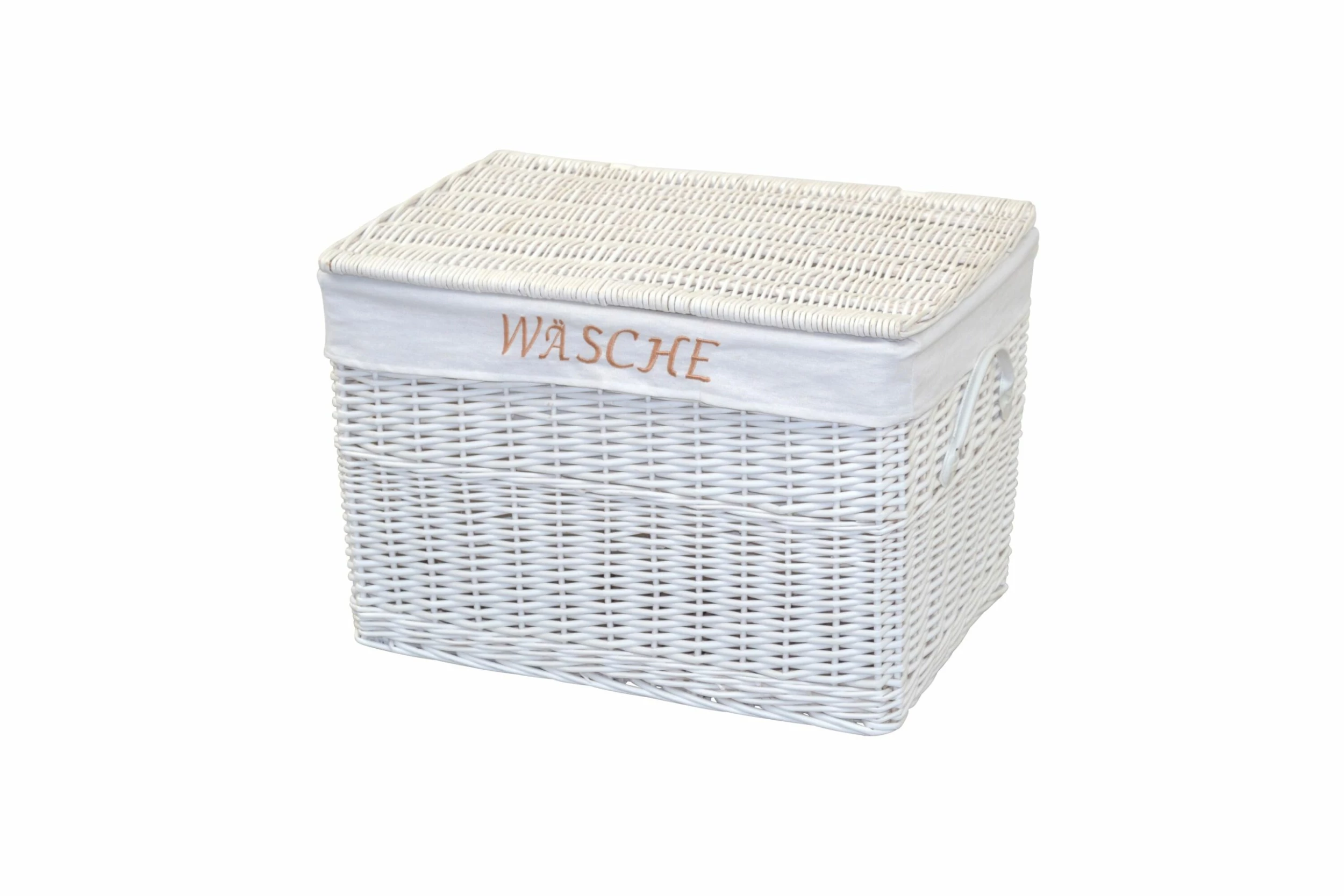 Praktischer Wäschekorb komplett aus Weide, handgeflochten. Mit praktischen aufklappbaren Deckel, innen mit einem Stoffeinsatz (100% Polyester) ausgestattet, der mit dem Schriftzug “WÄSCHE” bestickt ist. Rechts/links je ein Kunstledergriff (100% Polyvinylchlorid) angebracht. Lieferung der Wäschekörbe erfolgt montiert. Maße ca. cm: (B/H/T) 60/41/42. Lieferbar in zwei trendigen Farben.