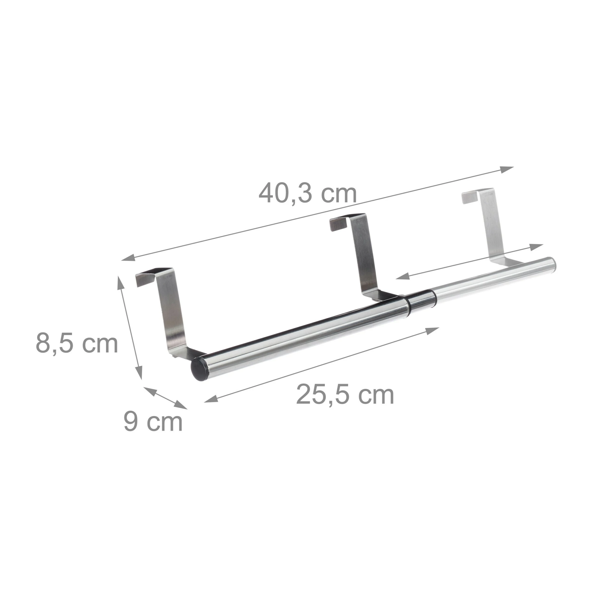 Die ausziehbare Handtuchstange hat einige Vorteile, die sie zu einem sehr nützlichem Begleiter im Haushalt machen. Um sie anzubringen, kommen Sie ganz ohne Bohren aus: Der Handtuchhalter wird mithilfe der beiden Haken einfach an eine maximal 2,5 cm dicke Tür gehängt. Dadurch sind Hand- oder Geschirrtücher immer genau dort griffbereit, wo Sie sie gerade benötigen. Die optimale Breite der Stange können Sie zwischen 25 und 40 cm variabel festlegen. Der zusammengeschobene Türhandtuchhalter lässt sich überall platzsparend verstauen – praktisch!
