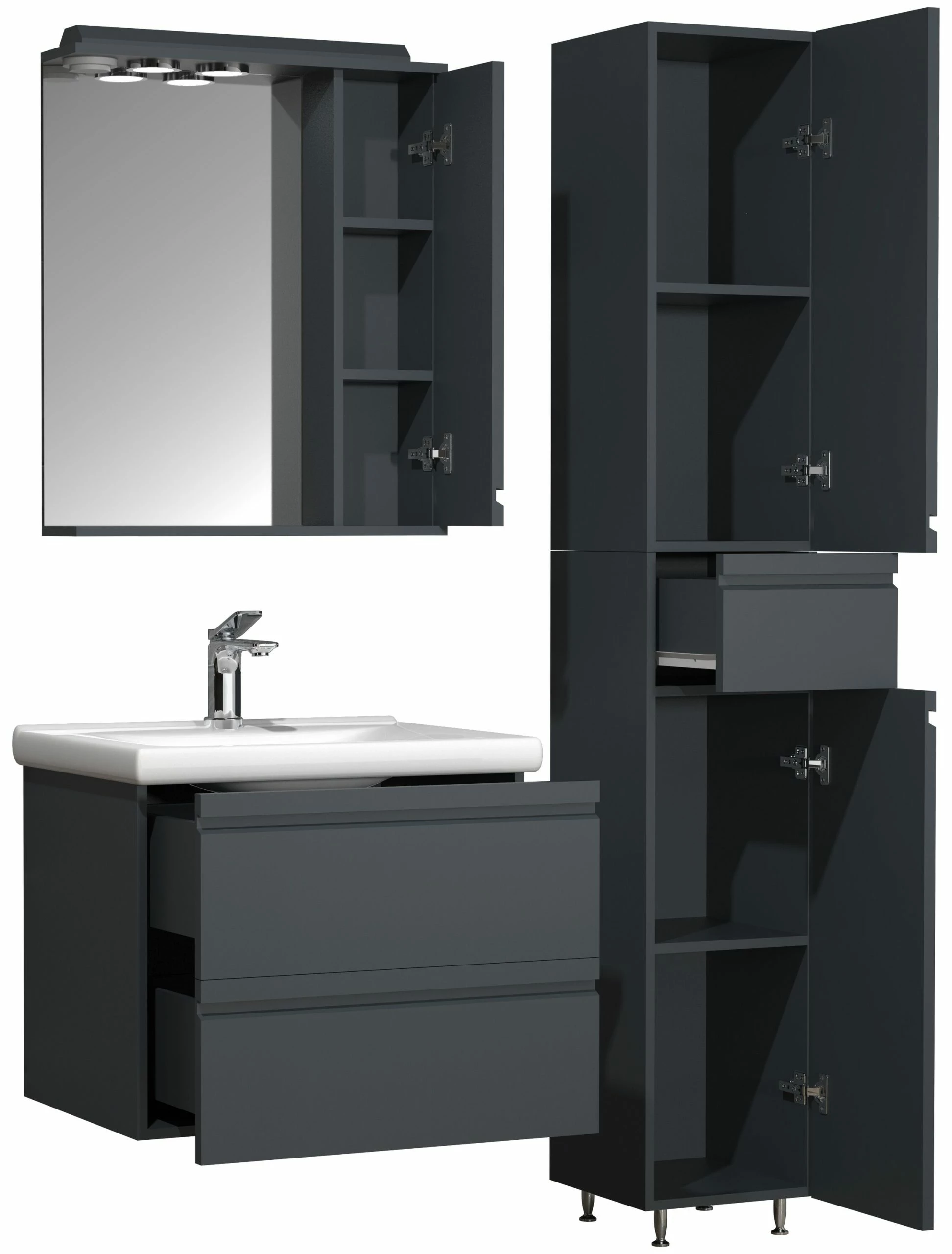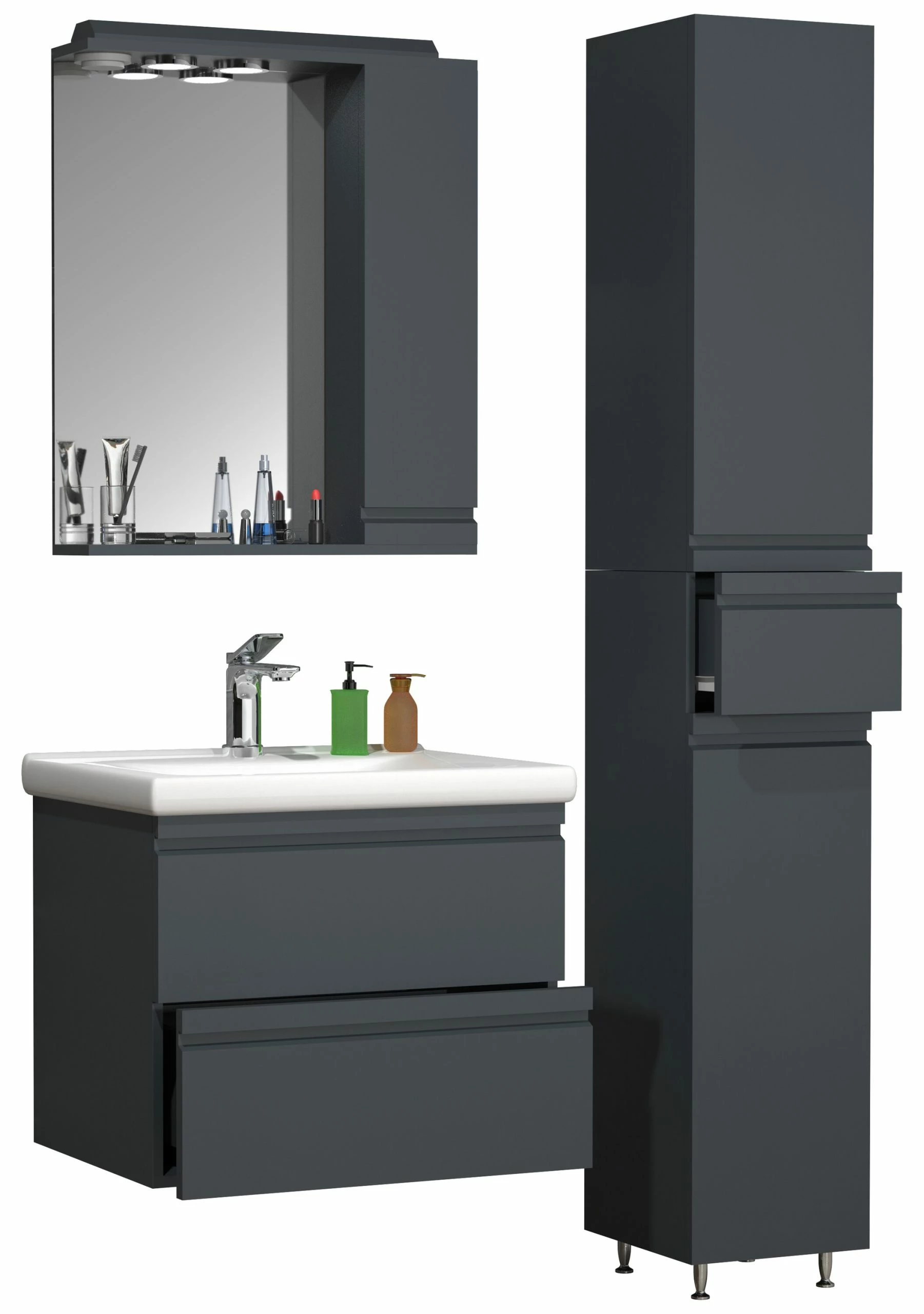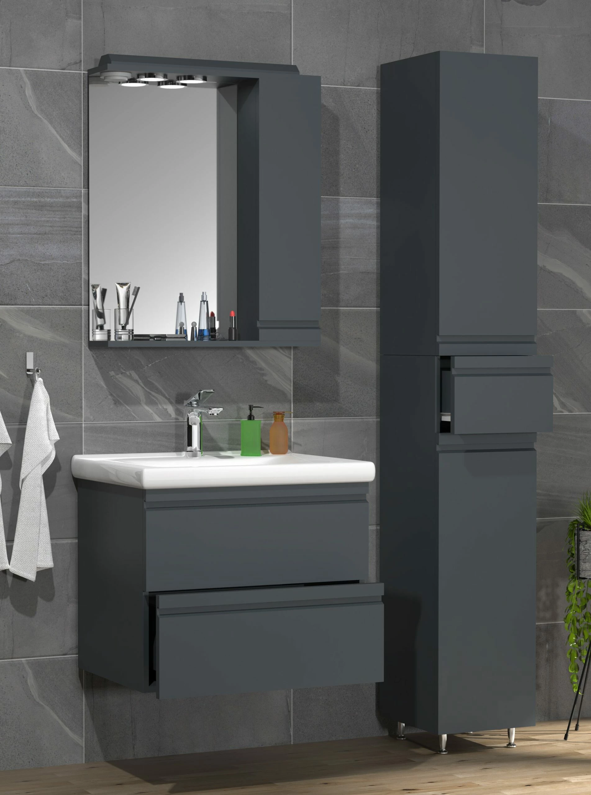 Das VCM Badmöbel-Set “Silora” besteht aus einem Unterschrank mit zwei Schubladen und einem Waschbecken aus massiver Keramik, sowie einem Spiegelschrank und einem Hochschrank.