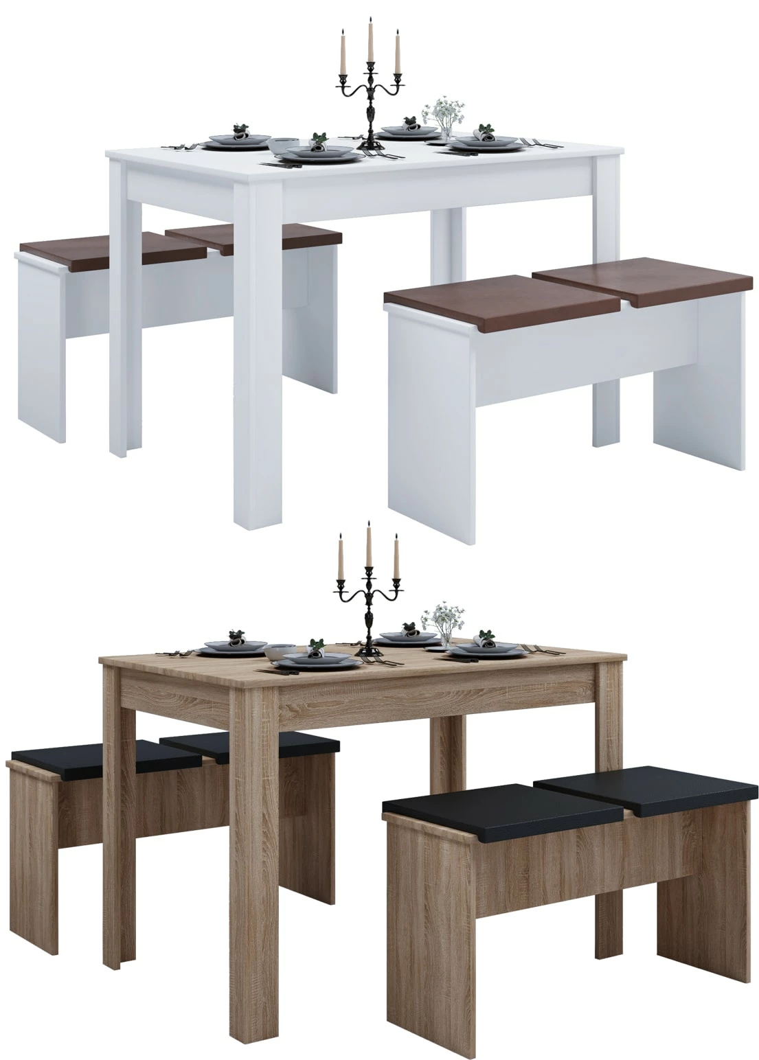 Das Möbel-Set ist nicht nur ein Blickfang, sondern auch ein sehr cleveres Funktionsmöbel, da die Tischbänke platzsparend unter dem Tisch verstaut werden können.