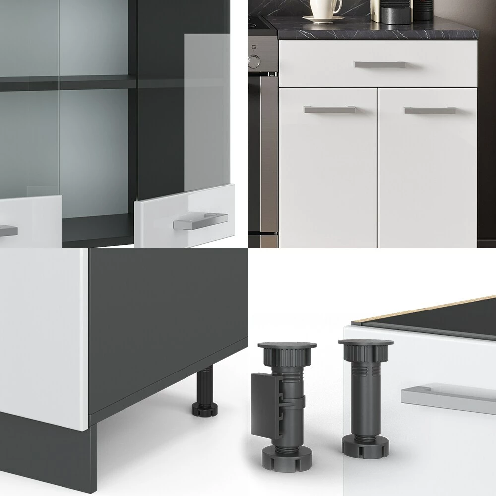 Die Schränke sind mit höhenverstellbaren Stellfüßen ausgestattet, dank denen sich Bodenunebenheiten mühelos ausgleichen lassen.