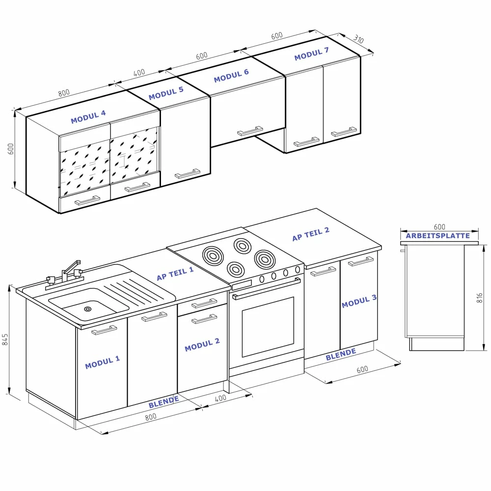 • Im Block ist sie 240 cm breit und benötigt daher nur wenig Stellfläche. Die Hängeschränke können bei dieser Küche individuell angebracht werden. Die Arbeitsplatten sind als tiefstes Element alle 60 cm tief.
