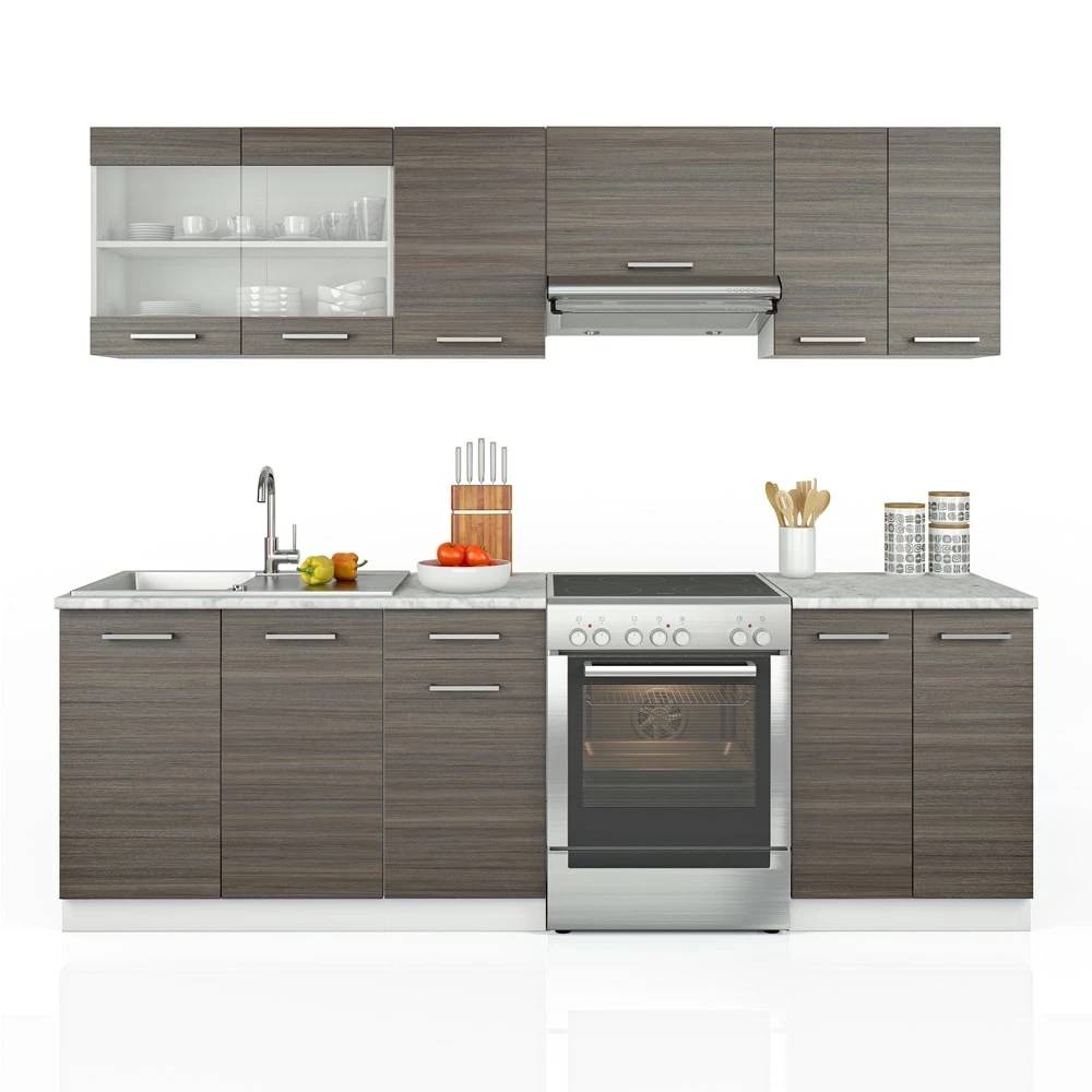 • Im Lieferumfang enthalten sind 7 einzelne Küchenschränke, 2 Arbeitsplatten, eine bebilderte und leicht verständliche Montageanleitung sowie die dazugehörigen Montagematerialien.