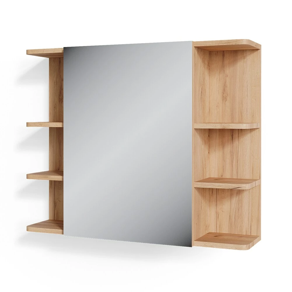 Neben dem geräumigen Innenfach, das horizontal durch einen Höhen verstellbaren Einlegeboden geteilt werden kann, befinden sich links und rechts neben dem Spiegelfach zusätzlich je 3 Abstellflächen für kleinere Badutensilien.