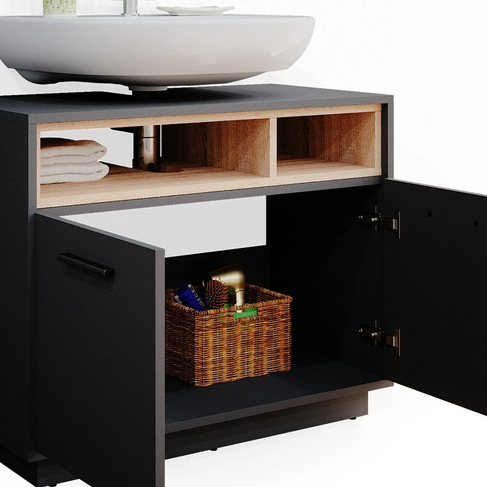 Unsere Badmöbelserie gibt es in zwei unterschiedlichen Farbvarianten. Hoch modern und funktional kann man zwischen Anthrazit oder Weiß wählen, welche jeweils mit edlen Eiche Einschüben ergänzt sind. Diese Design-Highlights werden sich hervorragend in jedes Bad einfügen und machen es zu einem Hingucker in jedem Zuhause